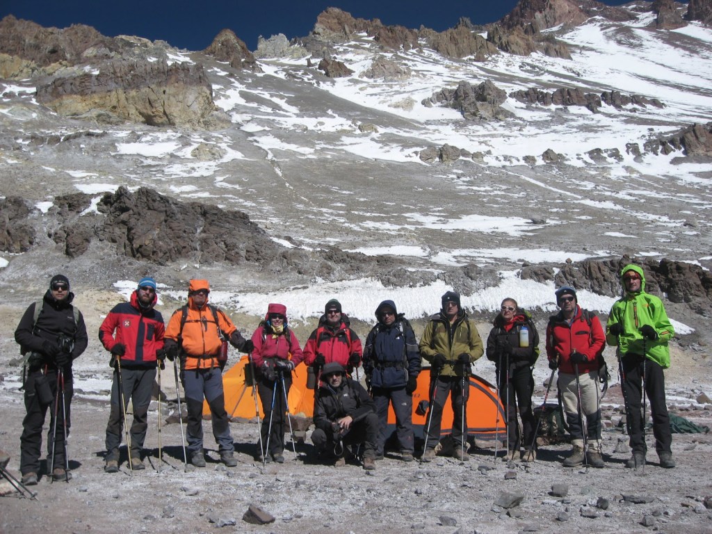 Naša ekipa u prvom visinskom kampu Nido de Condores 5.300mnv, pred polazak ka drugom visinskom kampu Berlina 6.000mnv. U pozadini vršni greben Aconcague.