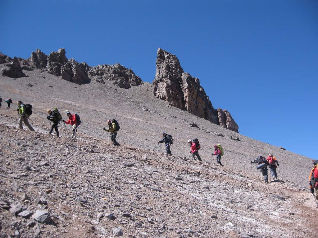 Kolona planinara od baznog logora Plaze de Mulas 4.300mnv do Nida de Condores, prvog visinskog kampa na 5.300mnv