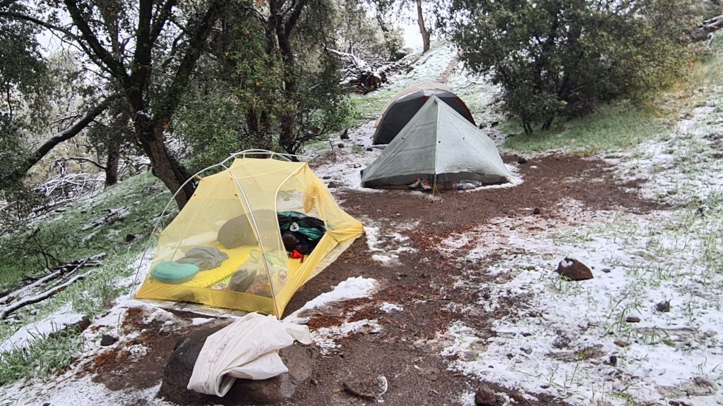 Prvi pravi test nakon gotovo mesec ipo dana šipčenja imali smo već narednog dana. Pored stalno prisutnog vetra, sa zapada su počeli da se navlače tamni oblaci. Mirisalo je na kišu. Slično kao na Andima, sve promene vremena na gore dolaze sa zapada, sa Pacifika. Do kampa smo stigli suvi, ali par minuta nakon što sam se zavukao u šator, krupne kapi kiše ubrzane vetrom, su počele da dobošaju po njemu. U predšatoru sam skuvao i večeru, što samo pojačava kondenzaciju unutra. Ali šta je tu je. Nije još uvek bilo mnogo hladno ali sam za svaki slučaj filter za vodu spakovao u quilt za spavanje zajedno sa baterijama, gpsom i telefonom. Lupalo je po šatoru do neko doba u noć i onda lagano prestalo. Tempreatura se spustila i kiša je prešla u sneg. Mokar i težak da je spuštao platno šatora skoro do mog hladnog nosa koji je jedini virio iz quilta. Svakih pola sata sam tresao konstrukciju da skinem sneg. Nije bilo mnogo spavanja tu noć. Ujutro niko da pomoli nos iz šatora. Treba spakovati sve mokro pa ako bude prilike sušiti usput. Ekipa se okupila kod Airdropa u šatoru i kartaju se. Ja sam se ipak spakovao i krenuo prvi da stignem Magneta koji je ptethodni dan spavao koju milju dalje.