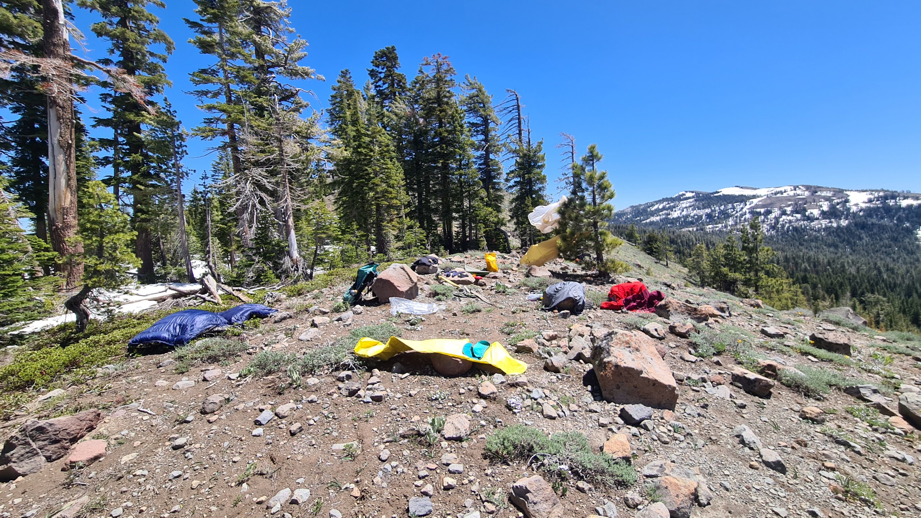 Staza se već par dana poklapa sa Tahoe Rim Trejlom. Naredno jutro smo prešli 1100 milju ali po prvi put od Meksika nismo našli oznaku jer je staza ponovo pod snegom. Tuna, Spanx i ja smo na brzinu napravili našu oznaku od štapova, slikali se i nastavili dalje. Vreme se lagano pogoršava, potpuno je oblačno. Na InReach sam proverio prognozu, i za sutra je najavljena kiša. Do narednog mesta gde možemo da se sklonimo – Donner pass, imamo bar dva dana hoda.
